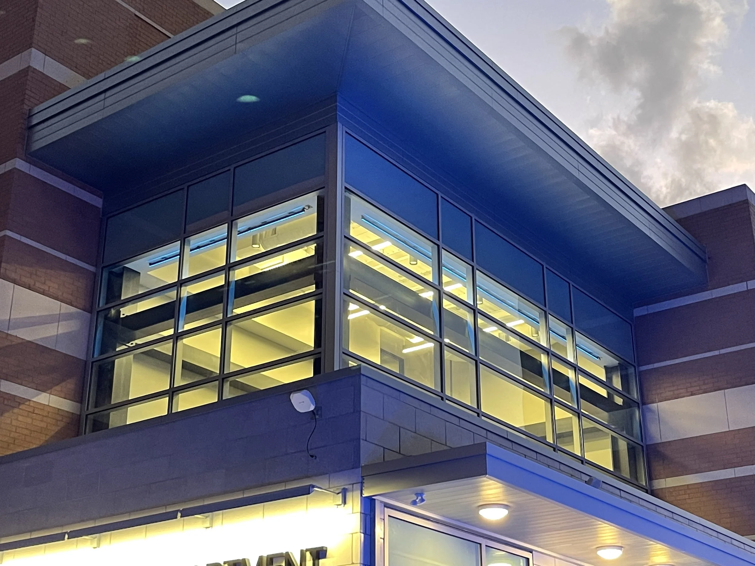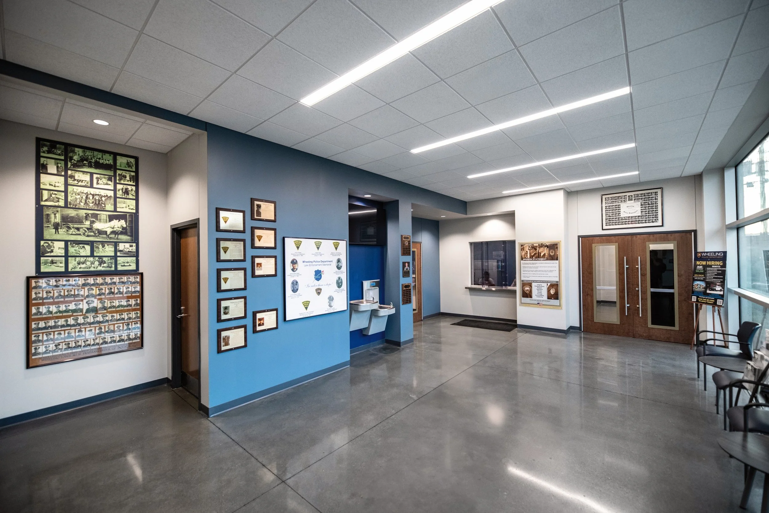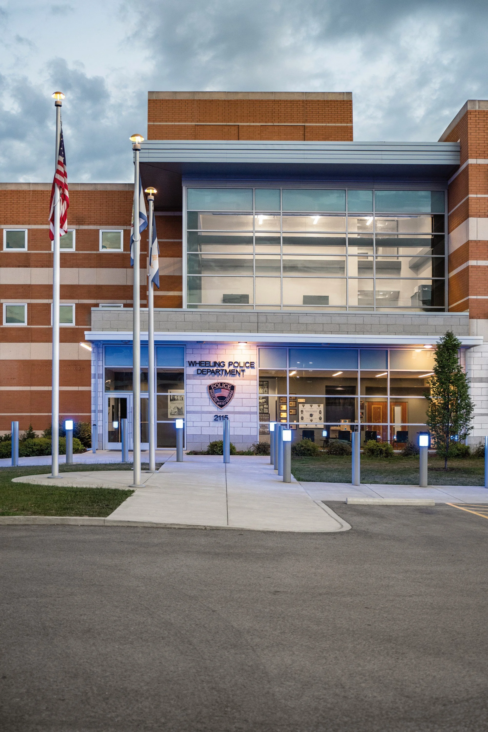 The design of this addition and renovation project adaptively reuses the existing Valley Professional Center in Wheeling, transforming it into a state-of-the-art police headquarters and regional training center for law enforcement. Amenities include an attached multi-level parking structure with secure parking and a sallyport, a revitalized site, exterior building envelope improvements, and a complete redesign of the entrance featuring a bullet-resistant lobby and a double-height, glass-enclosed break area on the second floor. The interior has been fully reimagined to include a community room, training spaces, offices, conference rooms, evidence storage, and a fitness facility.